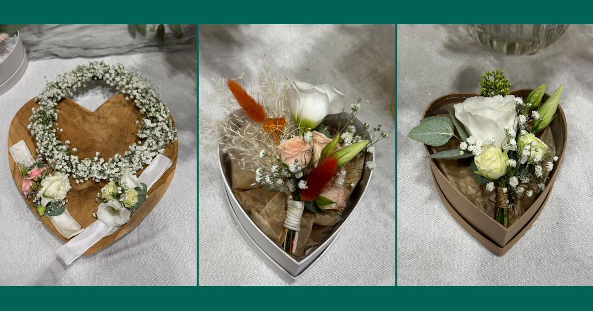 Pour mettre en valeur votre look, vous pouvez aussi opter pour un petit accessoire de cheveux à partir de 5 € ou un bracelet floral à partir de 8 €. Les coiffures et les poignets fleuris créent une continuité poétique qui ravit les regards. De son côté, le marié trouvera sa touche d’élégance dans une boutonnière assortie à partir de 6 €. Nous faisons en sorte que chaque détail épouse votre style et souligne la beauté de votre union.